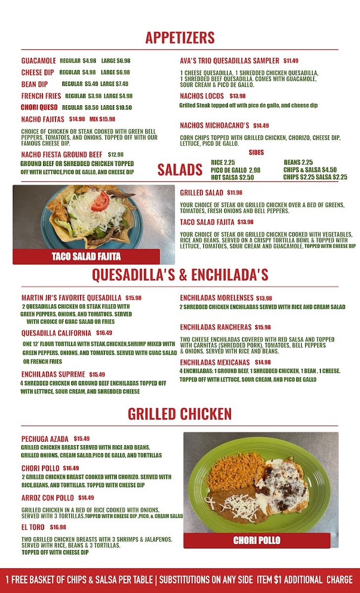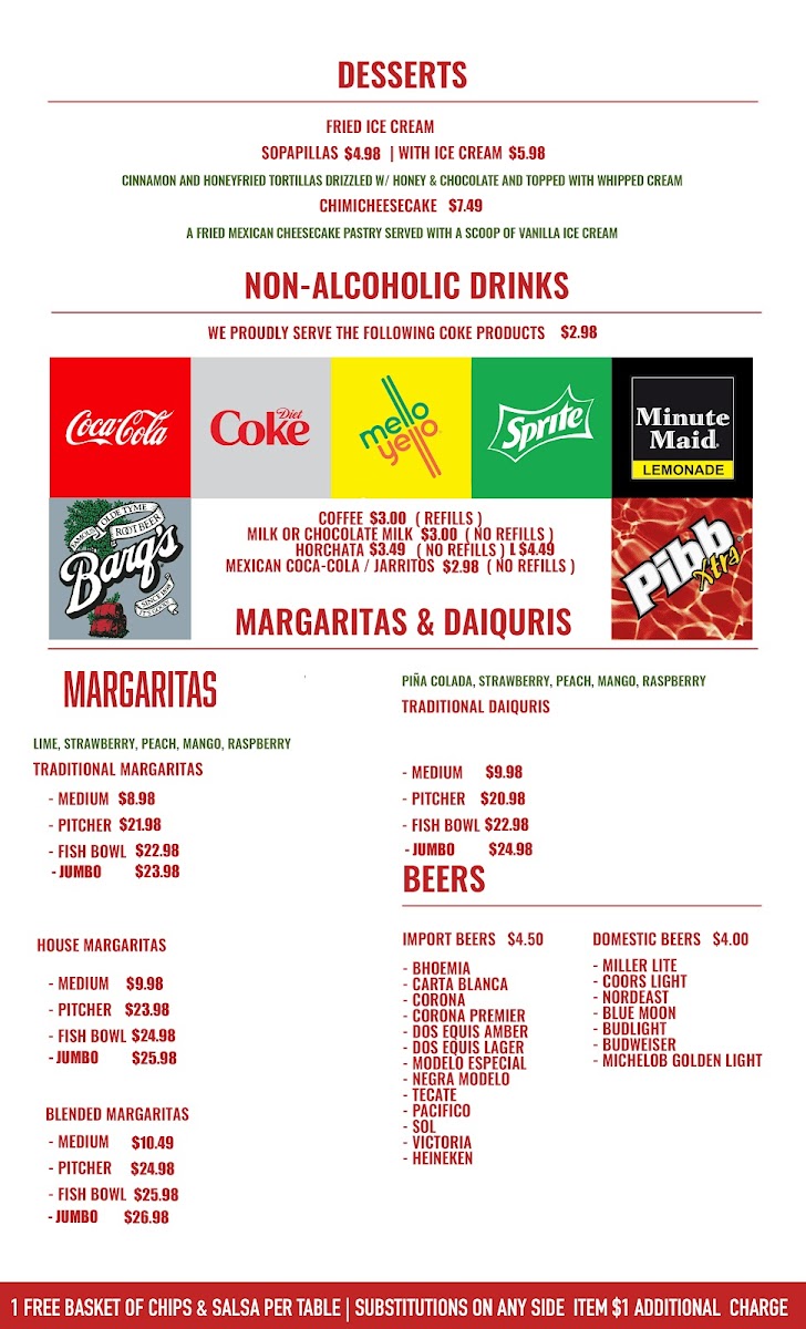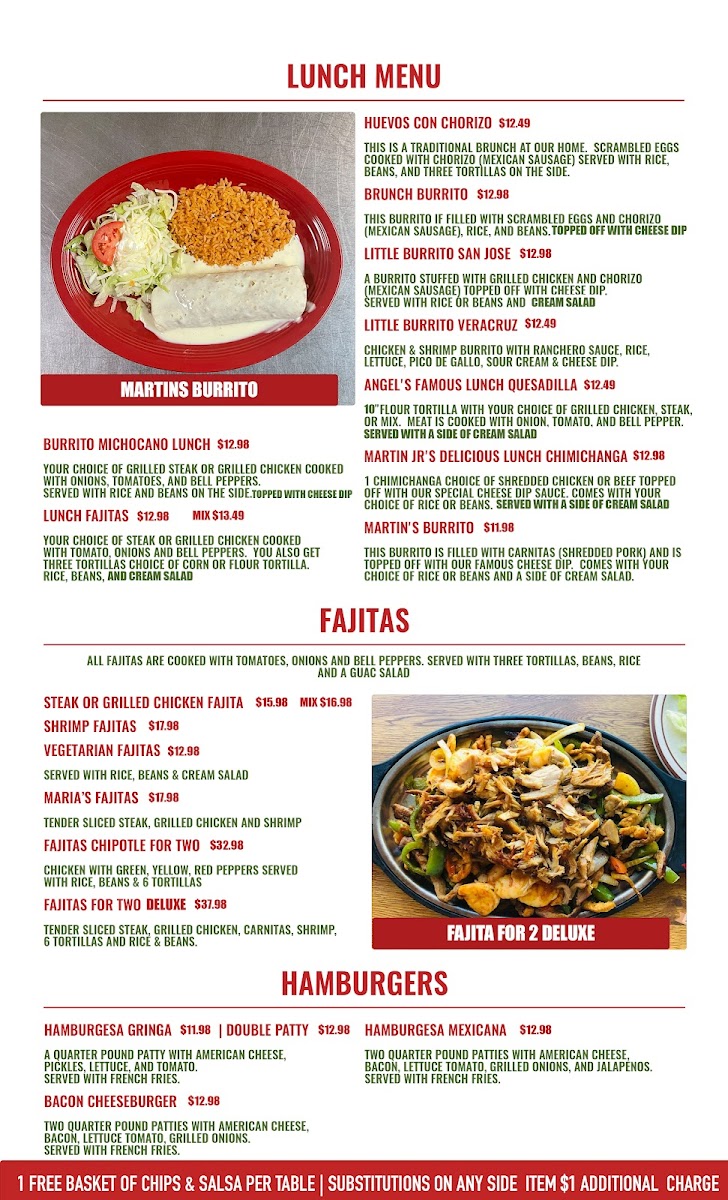 Start your meal with delightful Chips and Salsa ($4.50) or the zesty Chili Toreados ($2.50). Dive into hearty entrees like Huevos Con Chorizo ($12.49) or the irresistible Taco Salad Fajita ($13.98). Don’t overlook the Fried Ice Cream ($5.98) for a sweet finish!